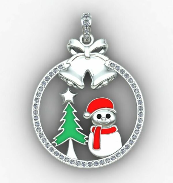 آویز کریسمسی 01 با ترکیب نماد های محبوب زمستانی، حس شادی و حال و هوای جشن کریسمس را در قالب یک زیور ظریف و درخشان زنده میکند. حلقهی اصلی آویز با ردیفی از نگین های ریز تزئین شده و جلوه ای چشمگیر ایجاد کرده است. در مرکز طرح، درخت کریسمس سبز و آدم برفی بامزه با کلاه و شال قرمز، فضای گرم و فانتزی فصل تعطیلات را بازتاب میدهند.