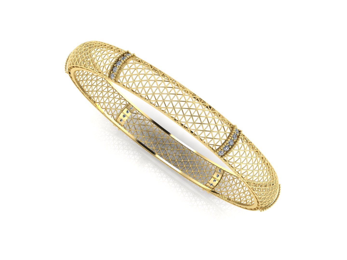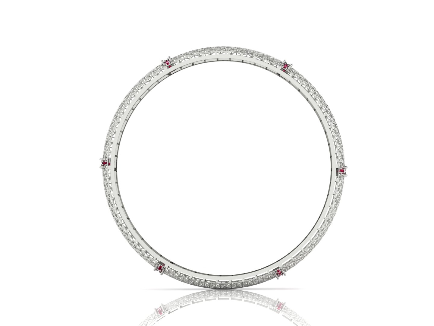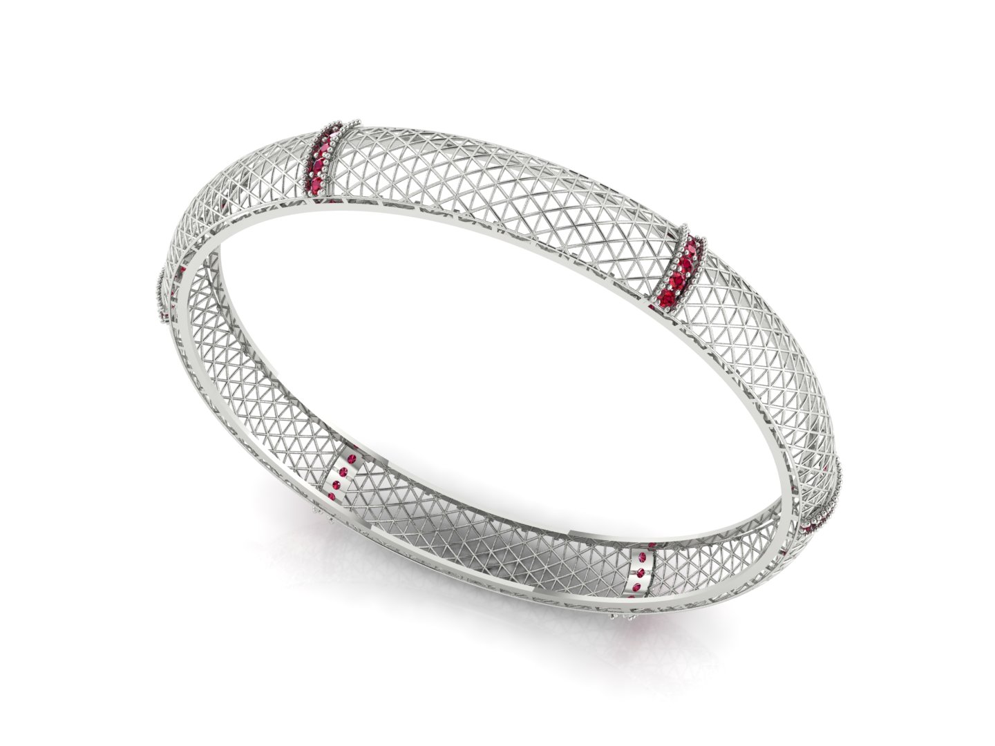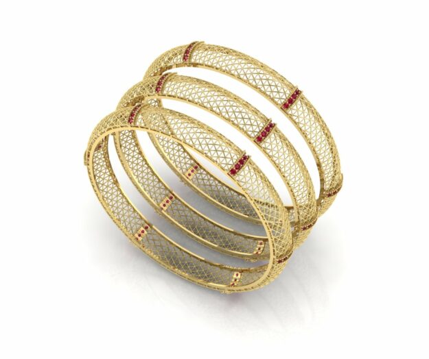 در بخش های مختلف النگو، ردیف های سنگ های قرمز با چیدمانی منظم استفاده شده که عمق بصری و ارزش هنری کار را چند برابر میکند. این نقاط سنگ خور با ایجاد تضاد رنگی میان طلای زرد و قرمز، هارمونی گرم و چشم نوازی را به وجود آورده اند. قرارگیری این سنگ ها در بخش هایی کاملاً هدفمند، نشان از دقت بالا در طراحی 3dm و stl دارد و باعث شده النگو ظاهری پرجزئیات و زیبا داشته باشد.