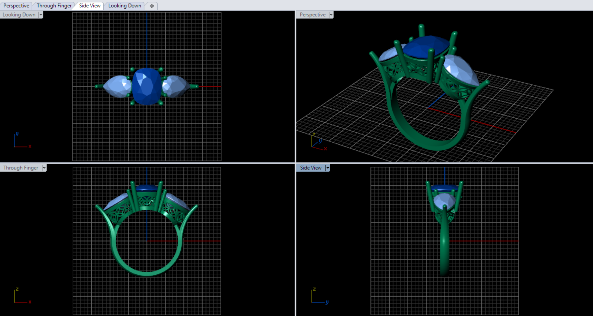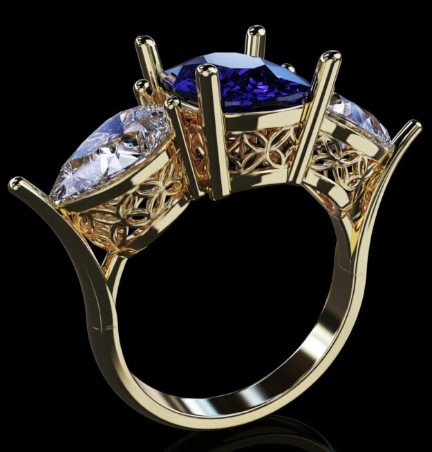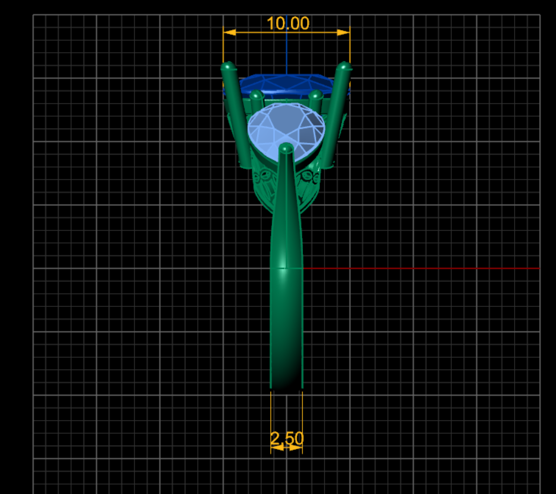 فرمت فایل به صورت STL تهیه شده و طراحی کامل در نرم افزار حرفه ای متریکس انجام شده که برای جواهرسازان امکان اجرای دقیق جزئیات را فراهم می سازد. بخش زیر نگین ها با ساختار مشبک و ظریف تزئین شده که به عبور نور و افزایش درخشش سنگ ها کمک میکند، در حالی که چنگه های نگین با دقت و تمیزی شکل گرفته اند تا نگین ها را ایمن و زیبا در جای خود نگه دارند.