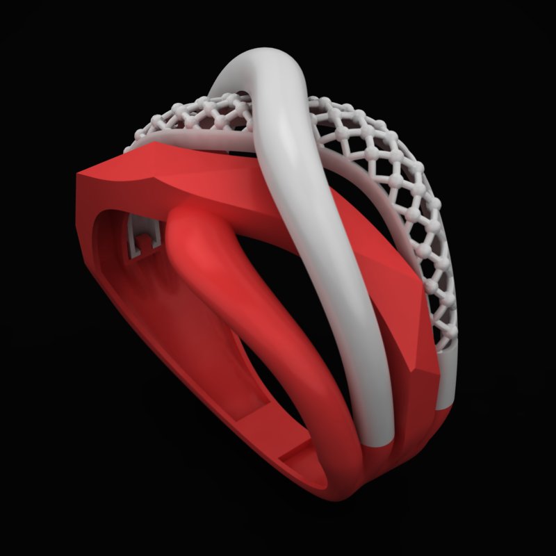 انگشتر تراش خور R-T-A-09 نمونه ای برجسته از طراحی مدرن در تلفیق خطوط ارگانیک و هندسی است که با دقت در نرم افزار Matrix خلق شده است. ساختار پیچیده و لایه دار آن از دو فرم متقاطع تشکیل شده که حس پویایی، حجم و حرکت را در طرح زنده می کند. ترکیب جلوه مشبک در قسمت بالایی و فرم های منحنی در بخش زیرین، نمادی از توازن بین صنعت و هنر بوده و جلوه ای خاص به دست افزار میبخشد. این انگشتر، جلوه ای نوآورانه از زیورآلات آینده نگر محسوب می شود.
