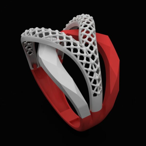 طراحی دقیق این انگشتر در نرم افزار Matrix، امکان شکل دهی چندلایه و جزئیات ریز را فراهم کرده است. با ابعاد 21*15.5*5 میلیمتر و ضخامت ظریف ۰.۳ میلیمتر، ساختار سه بعدی مدل به گونه ای تنظیم شده که استحکام بالا را در کنار سبکی بینظیر تضمین می کند. جنس پیشنهادی برای تولید آن می تواند شامل طلا، نقره یا پلاتین باشد تا با درخشش فلزات گرانبها، حجم شبکه ای آن جلوه ای مجسمه گونه پیدا کند.