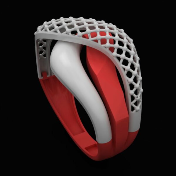 از منظر زیبایی شناسی، این انگشتر ترکیبی جسورانه از فرم های متضاد است. بدنه اصلی انگشتر با رنگ قرمز و سطوح تراش خورده و هندسی، حسی از استحکام و قدرت را القا میکند. در مقابل، یک فرم نرم، ارگانیک و سفید رنگ از میان این ساختار سخت عبور کرده و تضادی چشم نواز ایجاد می کند. اوج این طراحی در بخش بالایی انگشتر نمایان میشود، جایی که یک ساختار شبکه ای سفیدرنگ با ظرافت تمام، دو سمت انگشتر را به هم متصل کرده و ظاهری مدرن و معماری گونه به آن بخشیده است. این تلاقی بین خطوط صاف و منحنی ها، و همچنین تضاد رنگی، به این قطعه عمق و پویایی بصری فوق العاده ای می بخشد.