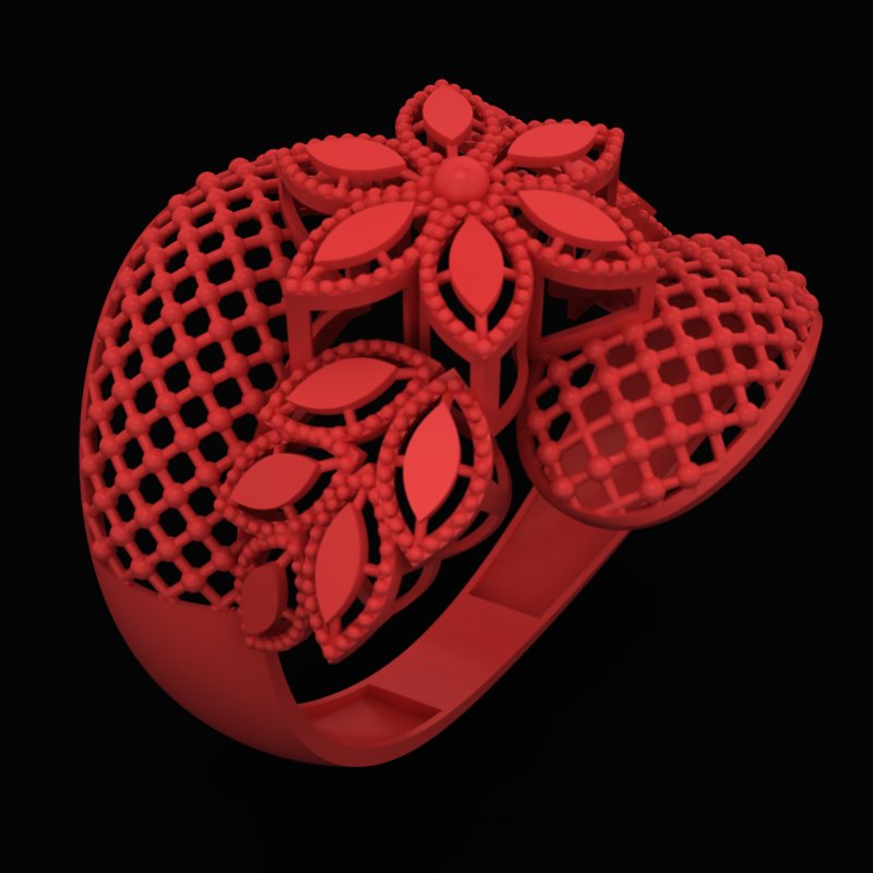 ضخامت 0.3 میلیمتر در کنار وزن 4.3 گرم، نتیجه طراحی هوشمندانه و استفاده از ساختار مشبک در بخش های جانبی است. این شبکه هندسی علاوه بر کاهش وزن کلی، به انگشتر ظاهری مدرن و حرفهای میبخشد و آن را برای تولید دقیق با حداقل مصرف متریال مناسب میسازد.