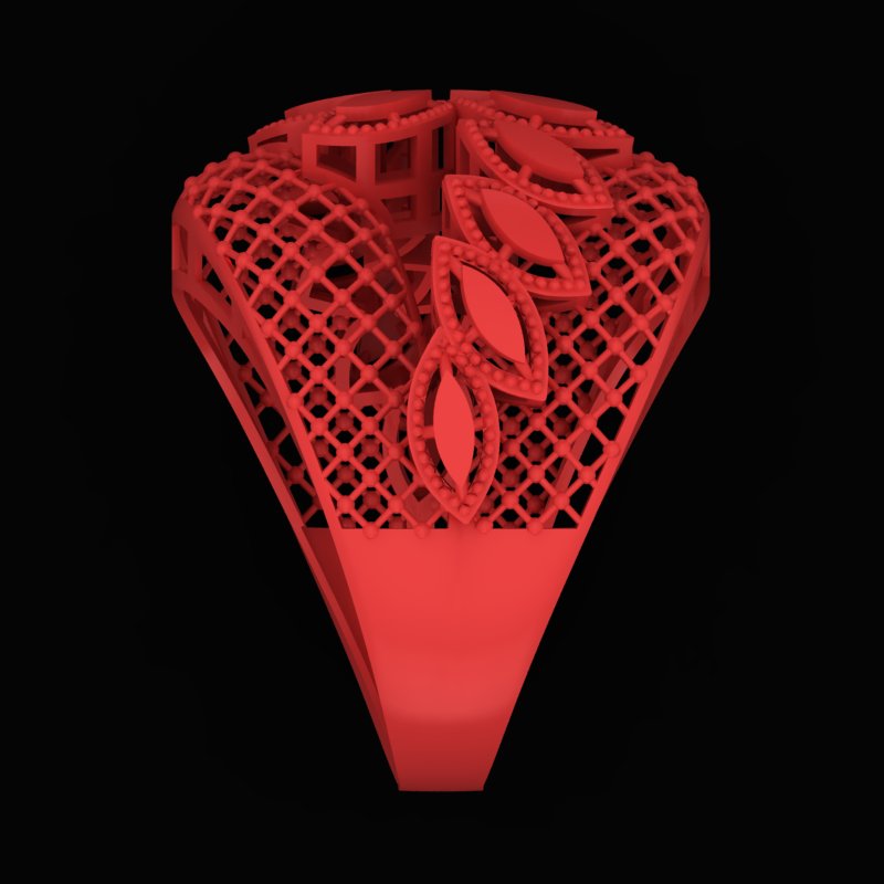 انگشتر تراش طرح مارکیز R-T-Marquise-15 با طراحی حجمی و ساختار شبکه ای، جلوه ای بسیار شاخص و لوکس ایجاد میکند. ترکیب فرم های مارکیز منظم در بخش فوقانی با بافت مشبک عمیق در بدنه، این مدل را به نمونه ای کاملاً حرفه ای و مناسب طرح های خاص و مجلسی تبدیل کرده است.