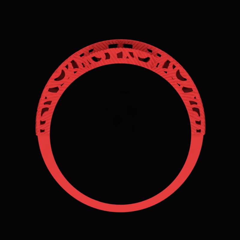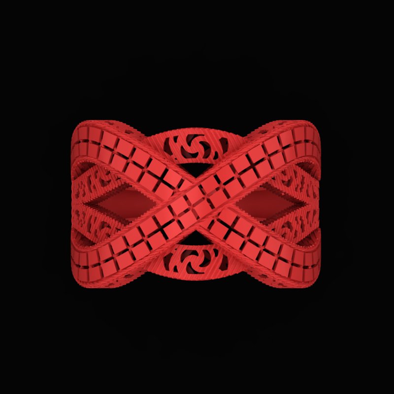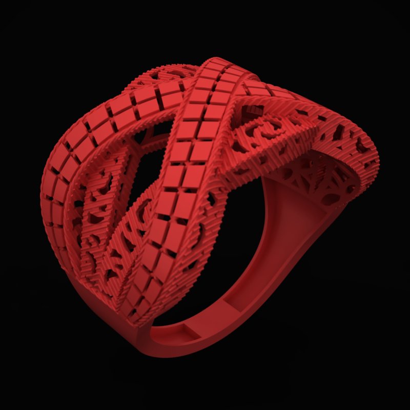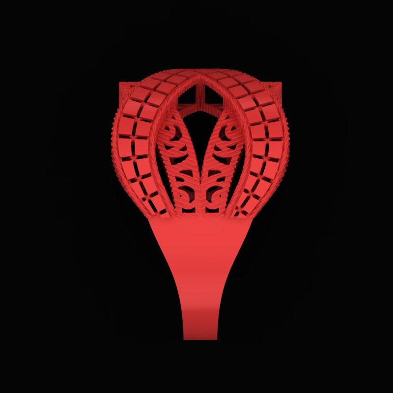 در طراحی تاج انگشتر، الگو های مکعبی منظم در کنار بافت های مشبک تزئینی به کار رفته اند که حس معماری و استحکام را القا میکنند. این تداخل لایه ها و بافت ها باعث شده انگشتر از زوایای مختلف، عمق بصری بالا و جلوه ای حرفه ای و دقیق داشته باشد.