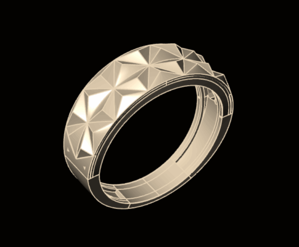 انگشتر تراش کد 03 با الگویی چند وجهی و حجم هندسی برجسته، نمودی منحصر به فرد از هنر مدرن در طراحی جواهرات است. سطح حلقه با هرم های منظم و متقارن، نمایی سه بعدی آفریده که بازتاب نور را به شکل خیره کننده، چند برابر میکند. این معماری خاص، حلقه را برای دوست داران جواهرات یونیک و متفاوت، به یک انتخاب عالی بدل نموده است.