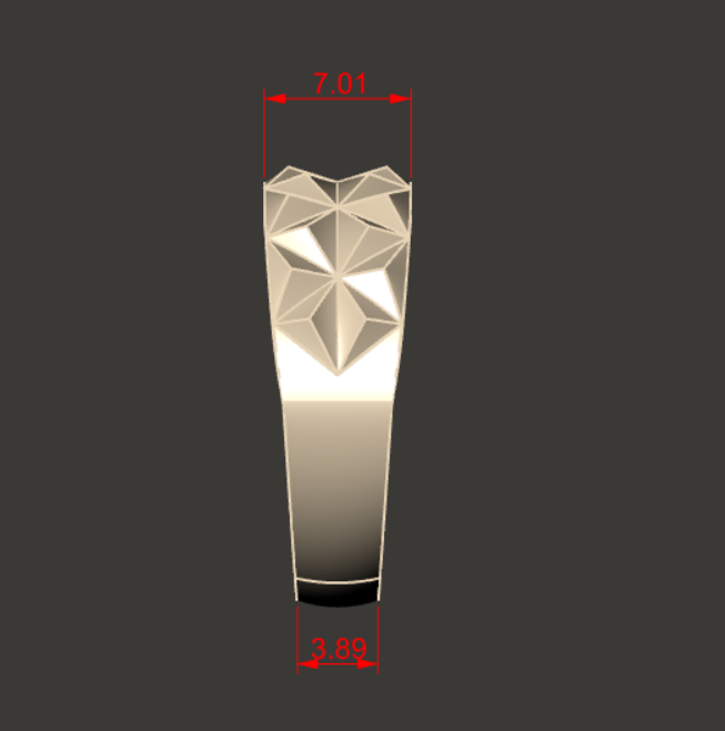 ابعاد این انگشتر شامل پهنا 7.01*3.89 میلیمتر، سایز 56 استاندارد و ضخامت بین 0.7 تا 0.45 میلیمتر است و وزن 4.41 گرم آن استفاده روزمره و راحت را بدون سنگینی برای مصرف کننده به ارمغان می آورد. مدل سازی با نرم افزار تخصصی متریکس و خروجی فرمت stl دقت بینظیر و اجرای کامل جزئیات را در ساخت این حلقه تضمین میکند.