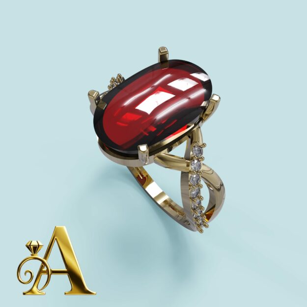 انگشتر رویال روبی با طراحی اختصاصی و ظرافتی مثال زدنی، ترکیبی از شکوه کلاسیک و مدرنیته را به نمایش میگذارد. نگین گارنت سرخ با رنگ عمیق و درخشش ویژه، جلوه ای سلطنتی به این انگشتر می بخشد. رکاب طلایی با خطوط نرم و منحنی های دقیق، هماهنگی کامل با سنگ اصلی ایجاد کرده تا یک اثر هنری کامل شکل گیرد.