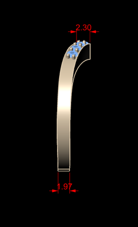 این مدل در فرمت stl و در نرم افزار متریکس طراحی شده و با ابعاد 2.30 میلیمتر، ضخامت 0.3 میلیمتر و وزن 1.90 گرم یک انگشتر بسیار سبک، راحت و مناسب استفاده روزمره محسوب میشود. ضخامت استاندارد و فرم مهندسی شده آن باعث میشود در عین ظرافت، دوام لازم برای استفاده طولانی مدت را داشته باشد. طراحی ساختار حلقه نیز باعث قرارگیری ایده آل آن روی دست میشود.
