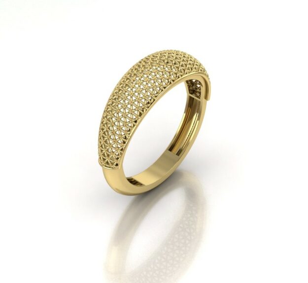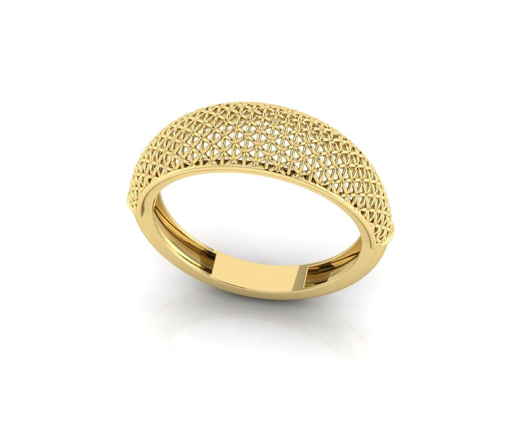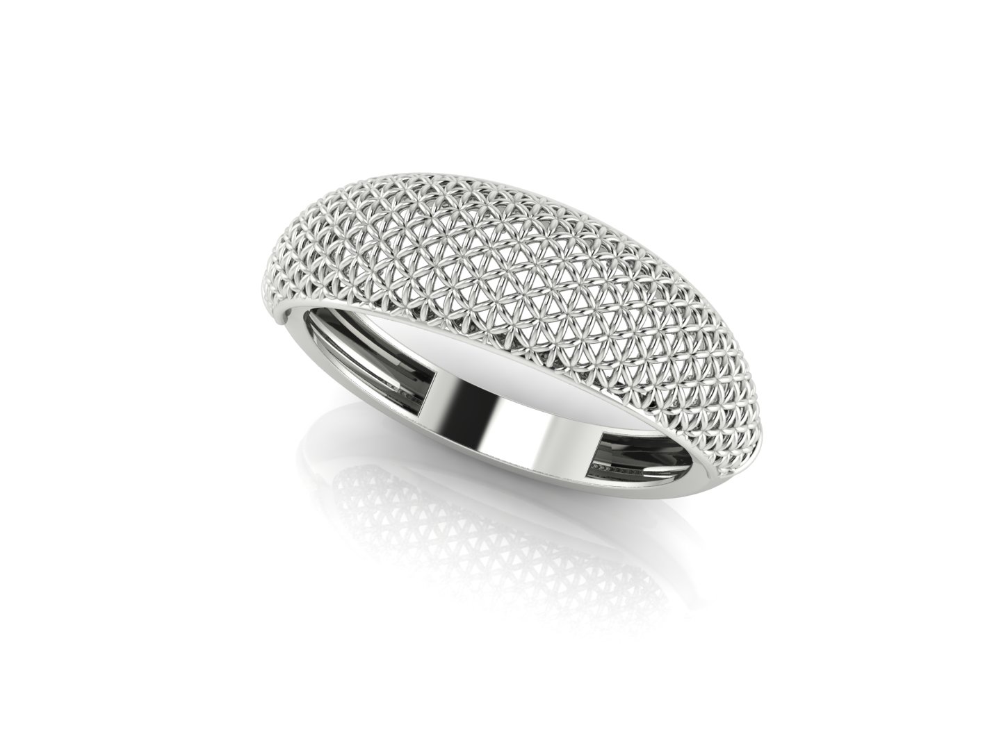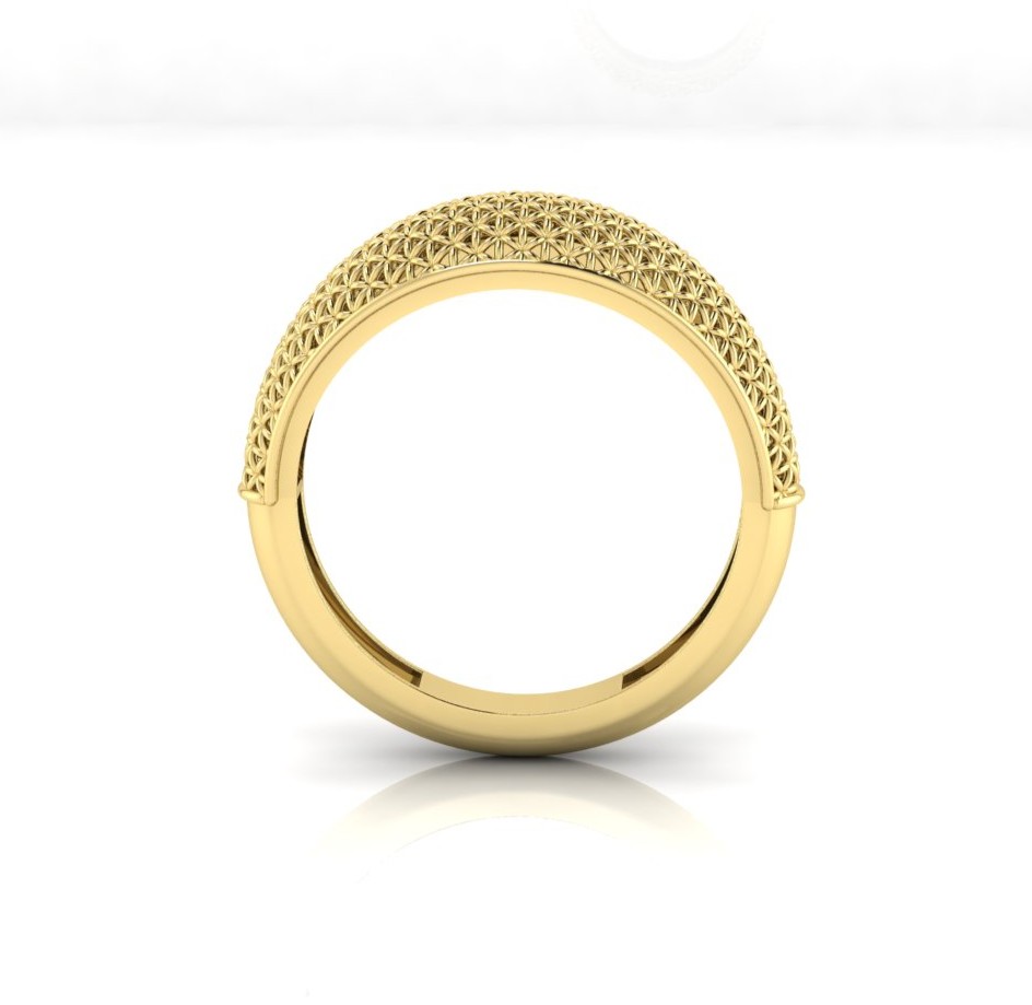 فرم گنبدی انگشتر در بخش رویه، سطحی یکدست و منحنی ارائه میدهد که باعث شده حضور آن روی دست بسیار ظریف اما درخشان باشد. این انحنا علاوه بر زیبایی، راحتی استفاده طولانی مدت را افزایش میدهد. تراکم الگوها به گونه ای انتخاب شده که ظاهر انگشتر هم سبک باشد و هم ارزش بصری کاملاً قابل توجهی داشته باشد.