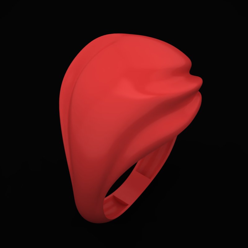 در نمای جانبی، سطح انگشتر حالتی مانند پارچه ای در حال پیچ و تاب دارد و بازتاب نور در نواحی براق، احساس عمق بیشتری به حجم کلی میبخشد. این الگوی ارگانیک، از جریان های طبیعی الهام گرفته و در قالب یک فرم دیجیتال بینقص بازآفرینی شده است. با استفاده از پرداخت مات در لایه های پایینی و براق در چینهای بالایی، درخشش متعادل و مدرنی به اثر اضافه شده که آن را به گزینه ای منحصر به فرد برای استفاده روزمره یا رسمی تبدیل میکند.