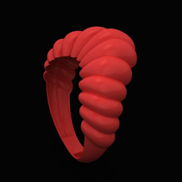 فرم انگشتر متشکل از لایه های حجمی با الگوی موجی است که در هر زاویه، نوری متفاوت را منعکس میکند. این تغییرپذیری در جلوه، یکی از امضاهای طراحی مدرن آن است و انگشتر را به جواهری با شخصیت پویا بدل میسازد. سطوح منحنی به گونه ای طراحی شده اند که بازی نور بر بافت مات و براق آن به صورت هماهنگ و نرم اتفاق بیفتد؛ گویی فلز زنده است و درهر لحظه شکل تازه ای میگیرد.