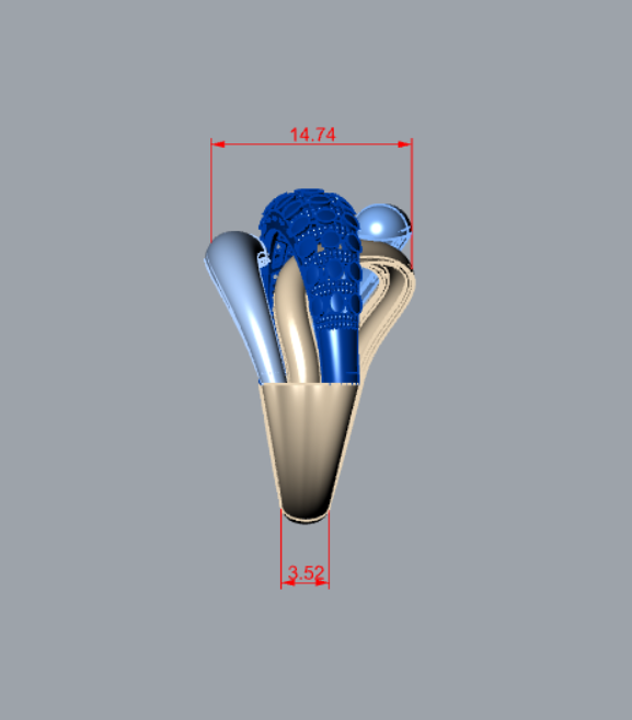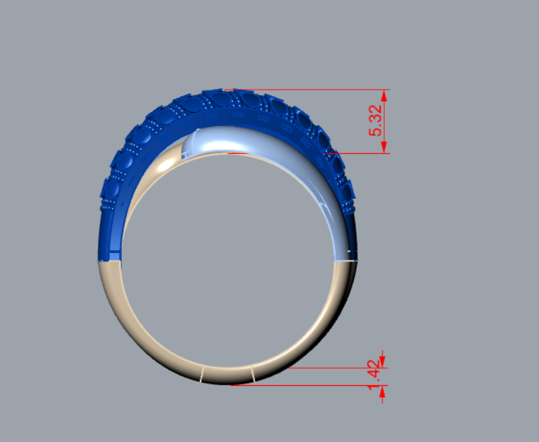 ابعاد این انگشتر با پهنای 15.53 میلیمتر و ارتفاع 3.16 میلیمتر، مناسب برای دست هایی با سایز 56 و ضخامت 0.45 تا 0.5 میلیمتر بوده و با وزن 5.70 گرم، تعادل خوبی بین استحکام و سبکی برقرار شده است. مدل سازی با نرم افزار متریکس و خروجی stl، امکان اجرای دقیق و بدون نقص جزئیات را در ساخت فراهم کرده و به تولید محصولی با کیفیت بالا منجر می شود.