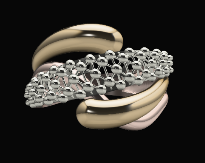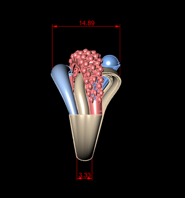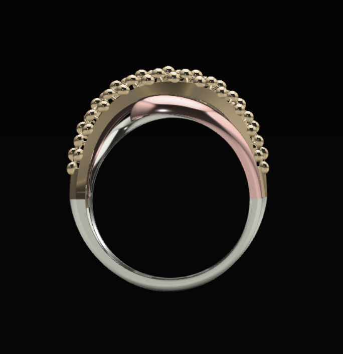ابعاد دقیق انگشتر با پهنای 14.88 و ارتفاع 3.33 میلیمتر، سایز 56 و ضخامت بین 0.45 تا 0.5 میلیمتر به همراه وزن 5.05 گرم، راحتی استفاده و فیت عالی روی دست فراهم می کند. فرآیند مدل سازی با نرم افزار متریکس انجام شد تا اتصال قطعات و هر جزئیات سطح، با وضوح و کیفیت بالا پیاده سازی گردد. طراحی متریال ها پرمخاطب است و امکان آبکاری طلا، رزگلد یا نقره طبق سلیقه وجود دارد.