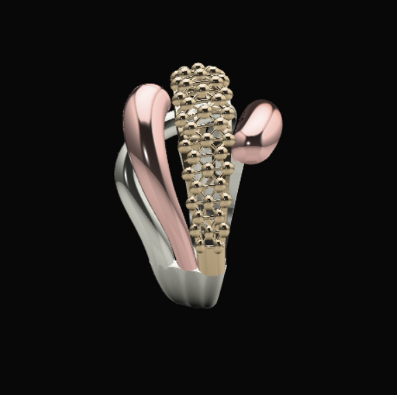 انگشتر چند تکه کد 05 با الهام از معماری مدرن و هنر ترکیب متریال های مختلف طراحی شده است. فرم منحنی و قطعات باریک طلایی و رزگلد، جلوه ای سه بعدی و چند لایه ایجاد کرده و توپک های طلایی به صورت منظم روی لایه ها چیده شده اند تا درخشش و حجم مطلوبی برای انگشتر تامین کنند. این ساختار ویژه، انگشتر را مناسب استایل های متفاوت از کلاسیک تا مدرن میسازد و نگاه هر بیننده ای را جذب می کند.