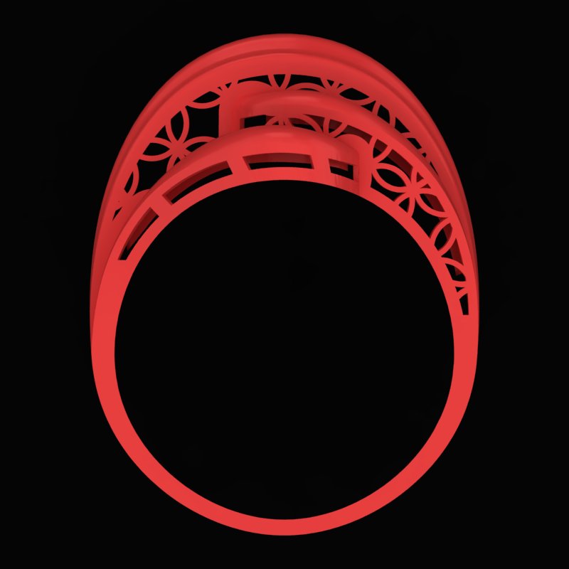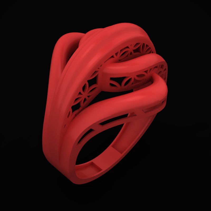 در نگاه نزدیکتر، سوراخ کاری های گل مانند میان باند های منحنی حس نفوذ نور و سایه را در اثر افزایش می دهند. با حرکت انگشت در زیر نور مستقیم، حلقه به صورت زنده واکنش نشان می دهد و در هر زاویه بازی جدیدی از درخشش و تیرگی پدید می آورد. به واسطهی این رفتار نوری و تناسب دقیق میان لایه های سطحی، R-Kazhal-17 نه تنها یک زیور بلکه بیانی هنری از طراحی محاسباتی در جهان جواهرات دیجیتال است.