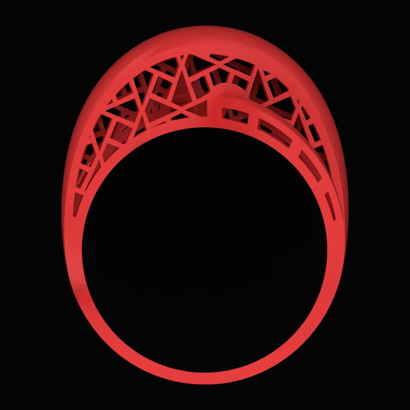 ابعاد دقیق 21.5*15*7.5 میلیمتر و وزن سبک ۳.۸ گرم نشان از برقراری توازن عالی میان حجم و سبکی دارد. ضخامت ۰.۳ میلیمتر با دقت بالا در مدل سازی تعامل بین سطح خارجی و شبکهی درونی را ممکن ساخته است. این ساختار پوسته شبکه ای نه تنها باعث استحکام بیشتر در حین ساخت می شود، بلکه جلوه ای معماری به اثر می بخشد. سبک طراحی در این انگشتر از فرم های معماری دیجیتال و ریاضیات فرم الهام گرفته تا بازتابی از آیندهی طراحی زیورآلات باشد.