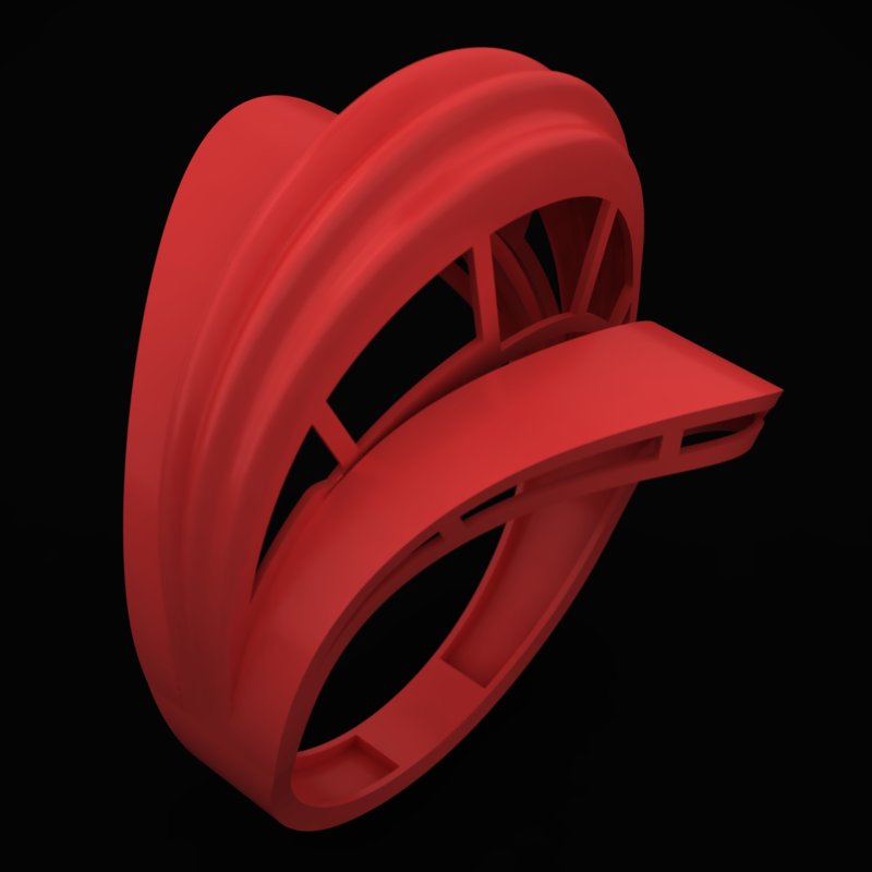 انگشتر کژال R-Kazhal-26 جلوه ای از فرم پویای معماری در کالبد یک زیور است. طراحی آن بر اساس تقاطع منحنی های نرم و خطوط برجسته شکل گرفته و در نگاه نخست، همانند موجی منجمد از حرکت به نظر میرسد. حجم مرکزی به نرمی از پایه جدا شده و با چرخشی تدریجی، سطح بالایی را در برگرفته است؛ حرکتی که یادآور رشد طبیعی و بی وزنی فرم های ارگانیک است. رنگ رندر قرمز، بیانگر انرژی ذاتی این انگشتر در مرحله مدل سازی دیجیتال است، جایی که مفهوم قدرت و ظرافت در یک ساختار واحد ادغام میشود.