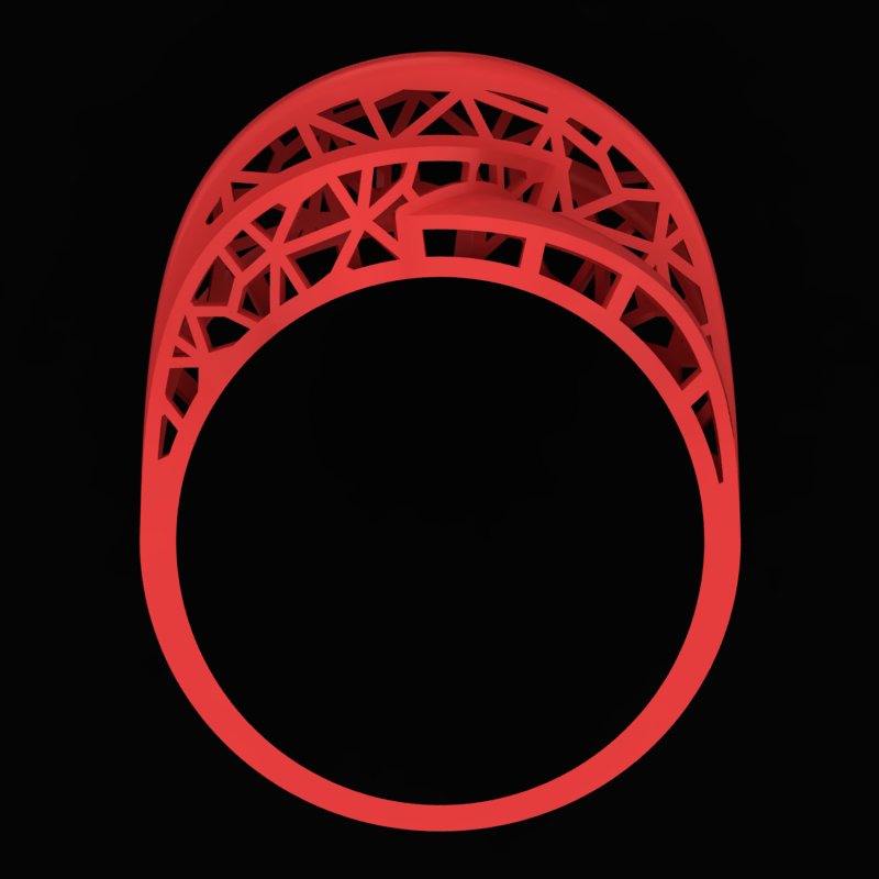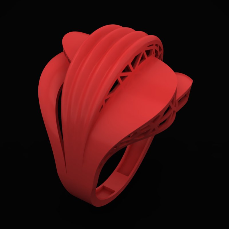 انگشتر کژال R-Kazhal-29 تلفیقی از هندسه آینده گرا و زبان نرم طراحی ارگانیک است. سه حجم منحنی در سطح بالا همچون گلبرگ هایی فلزی از مرکز بیرون آمده اند و با انحنا و ظرافتی دقیق در هم تنیده اند. بافت نیمه شبکه ای زیر حجم اصلی، حس سبکی و پیچیدگی هم زمان به طرح میدهد گویی یک سازه معماری در ابعاد مینیاتوری است. زاویه های متقاطع در بخش داخلی، عمق بصری و زیبایی ساختاری ویژه ای را ایجاد میکنند که بیننده را به تحلیل و لمس دعوت مینماید.