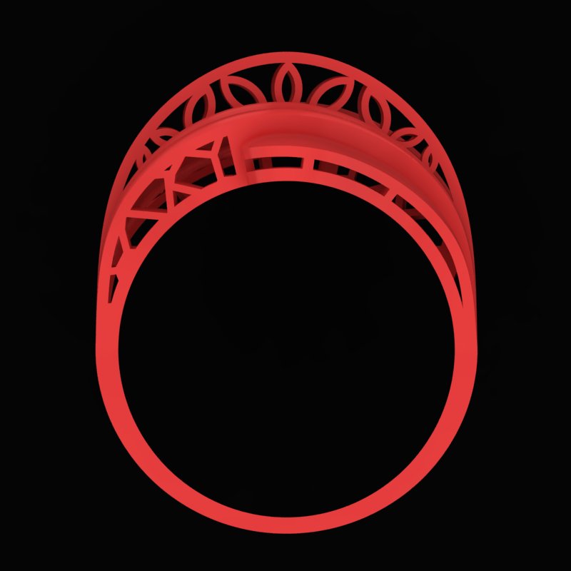 از دید فنی، این مدل با نرم افزار Matrix طراحی و در فرمت 3dm ذخیره شده است؛ سطحی دقیق و متوازن با هندسه قابل تولید برای ریخته گری حرفه ای دارد. ابعاد 20.5*20.5*7 میلیمتر در کنار ضخامت ظریف ۰.۳ میلیمتر و وزن ۴.۹ گرم باعث شده انگشتر سبک و پایدار باشد. ساختار داخلی دارای شبکه های سبک ساز و تقویتکننده است تا ضمن کاهش وزن، استحکام حفظ شود. این محاسبه دقیق، روح فناوری را در کالبد هنر به نمایش میگذارد.