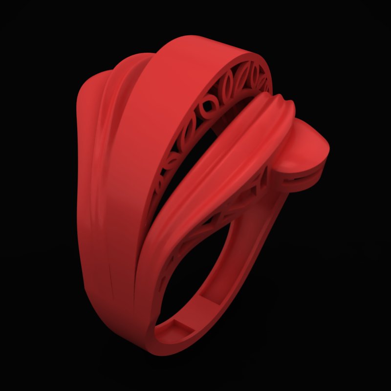 انگشتر کژال R-Kazhal-30 جلوه ای از حرکت و حجم است؛ فرمی سیال که میان خطوط نرم و پویا شکل گرفته و با بافت های درونی مشبک، عمق و ظرافتی مجسمه وار ایجاد کرده است. منحنی های اصلی از پایه تا تاج انگشتر با هماهنگی کامل امتداد یافته اند و نوارهای موازی با انحناهای آرام در بالای حلقه، حسی از جریان مداوم را به چشم القا میکنند. رنگ قرمز رندر، انرژی درونی طراحی را نمایان میسازد، انگشتری که در هر زاویه نور، روایت متفاوتی از قدرت و لطافت دارد.