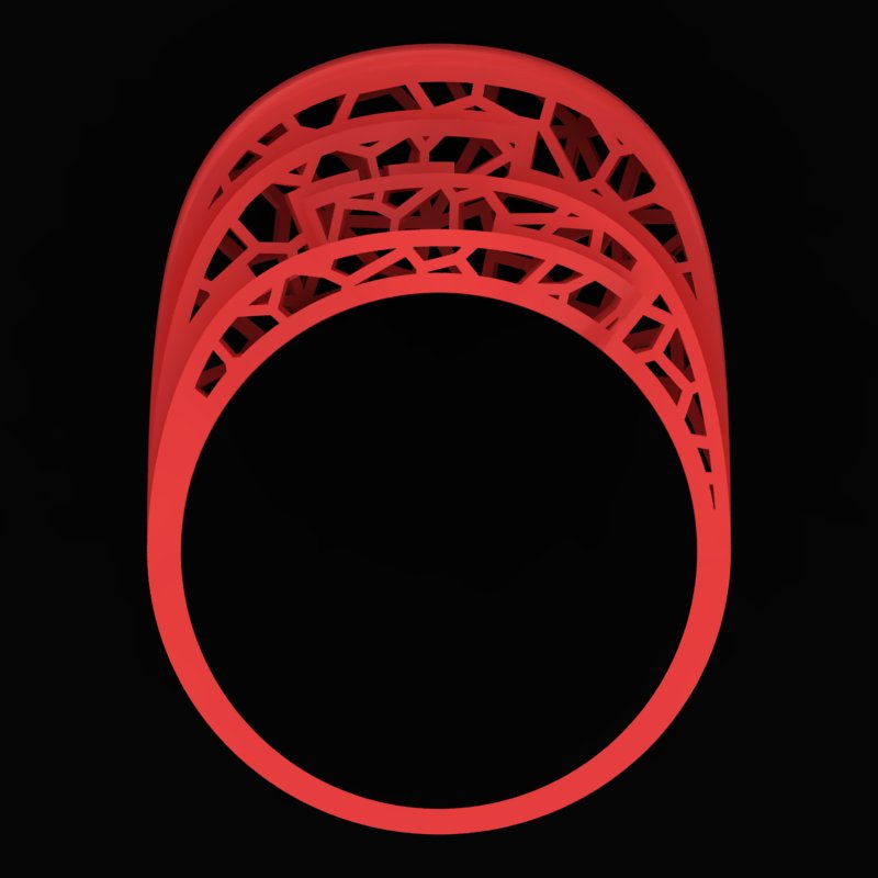 در حوزه فنی، انگشتر کژال R-Kazhal-33 با نرم افزار Matrix در فرمت 3dm ساخته شده است؛ هر انحنا و حفره با دقت محاسباتی بالا مدل سازی شده تا هم در ریخته گری و هم پرداخت نهایی دقت کامل حفظ گردد. ابعاد 20.5*19*9 میلیمتر در کنار ضخامت ظریف ۰.۳ میلیمتر و وزن ۴.۸ گرم، تناسبی مثال زدنی از سبکی و تعادل ارائه میدهد. سایز ۵۷ برای پوشش طبیعی انگشت متوسط بهینه شده و فرم ارگونومیک حلقه راحتی در استفاده را تضمین میکند. شبکه های داخلی ساختار، استحکام و کاهش وزن را بهطور همزمان فراهم نموده اند.