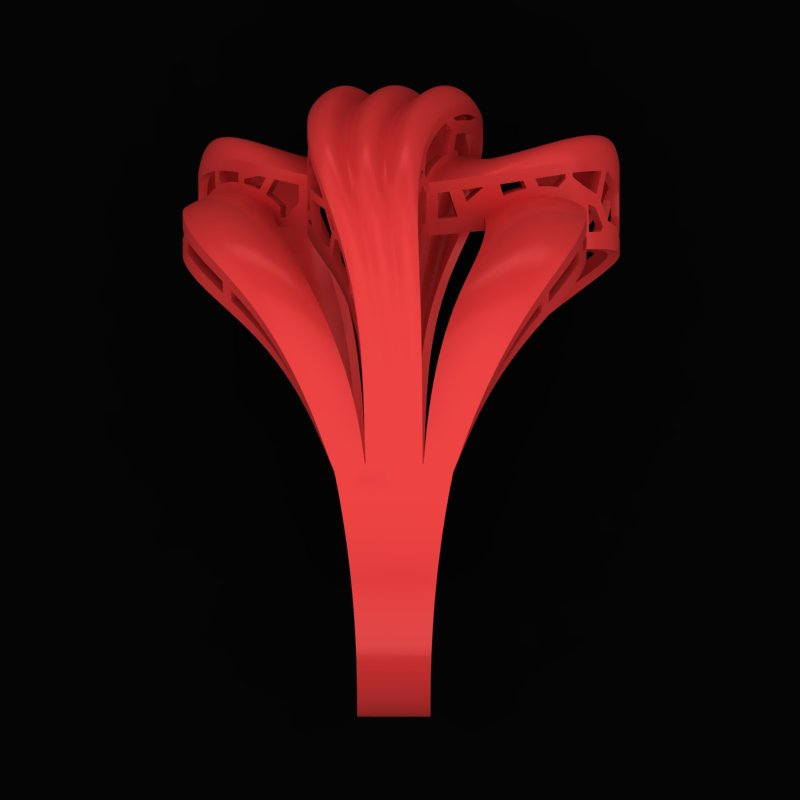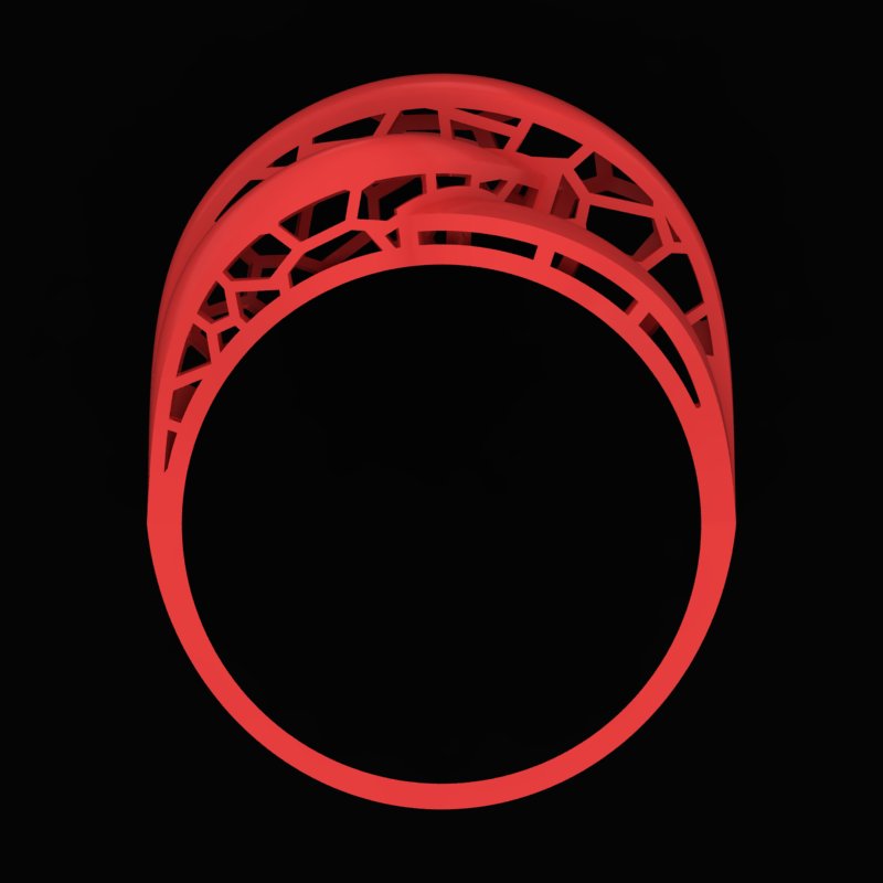 ساختار داخلی حلقه با الگوی چندضلعی باز، علاوه بر کاهش وزن، باعث ایجاد شفافیت و بعد بصری منحصر به فرد میشود. این شبکه ها همانند یک اسکلت هنری، فرم نرم و یکپارچهی بیرونی را حمایت میکنند و در عین حال سبک بودن و استحکام را تلفیق میکنند. نتیجه کار، انگشتری است که هم از نظر فنی و هم زیباییشناسی، سطح بالایی دارد.