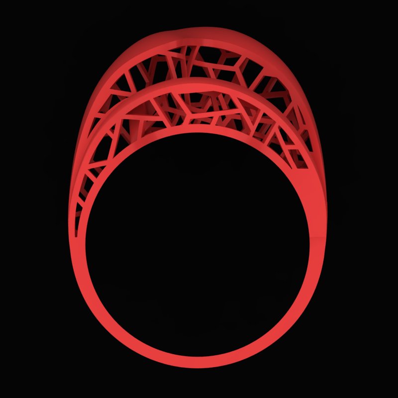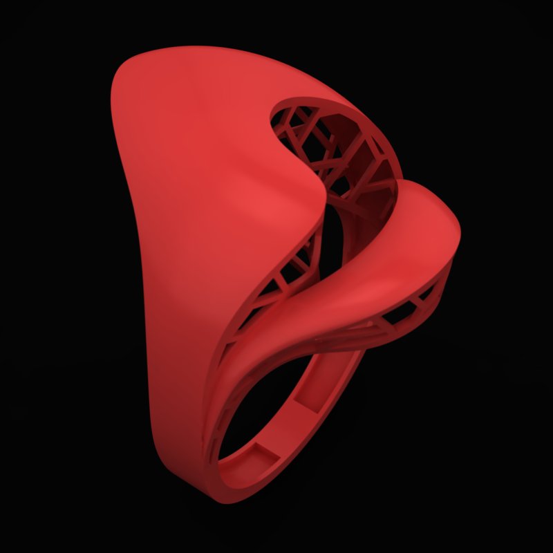 در طراحی R-Kazhal-42، فرم بیرونی با انحنایی آزاد و روان، بر حجم بالایی انگشت تمرکز دارد؛ در حالی که ساختار داخلی به گونه ای مهندسی شده تا با حداقل مواد، بیشترین استحکام را ارائه دهد. بازی میان سطح و فضا، آن را به اثری نیمه مجسمه وار تبدیل کرده است. چنین نگرشی، زیبایی دیجیتال را به حوزه جواهرسازی سنتی میآورد و نقطه تلاقی دو جهان هنر و فناوری را شکل میدهد.