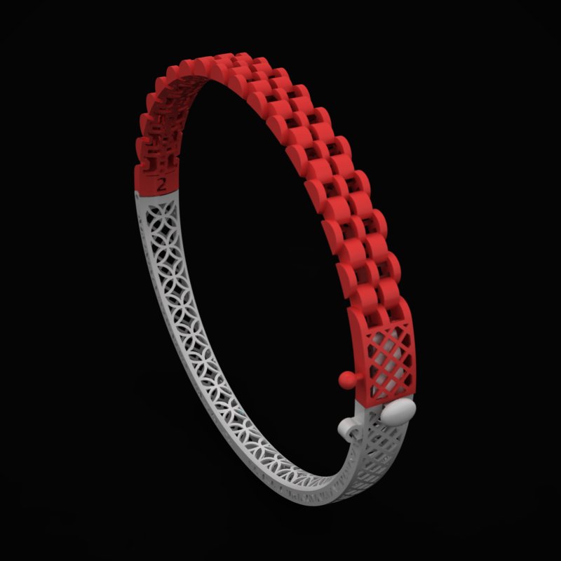 این دستبند در نرم افزار متریکس و با فرمت 3dm طراحی شده و ابعاد 67*6.5*3 میلیمتر آن نشان میدهد که مدل در دستهی بند های باریکتر اما ساختار یافته قرار میگیرد. ضخامت 0.3 میلیمتر و وزن 10.9 گرم، آن را سبک و خوش تعادل میسازد. سایز (2) با اندازه داخلی 58*50 میلیمتر نیز استاندارد رایج مدل های رولکسی است و برای بیشتر افراد مناسب خواهد بود.