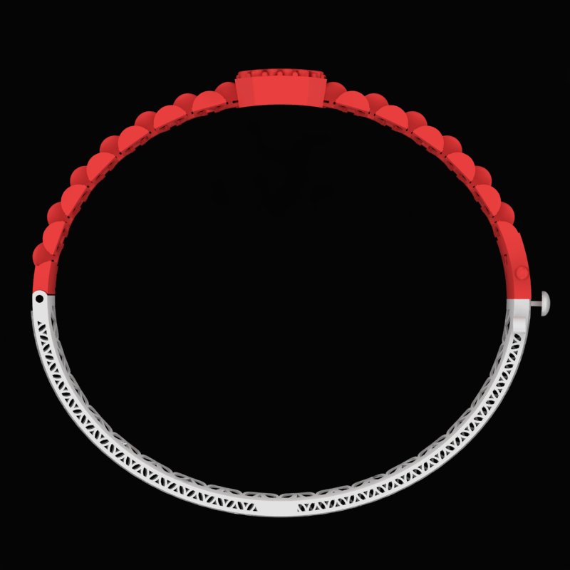 در قسمت داخلی دستبند، ساختار مشبک هندسی با ظرافت بسیار بالا طراحی شده است. این بافت شبکه ای علاوه بر زیبایی بصری، وزن محصول را کاهش داده و گردش هوا را افزایش میدهد تا هنگام استفاده طولانی مدت، راحتی بیشتری روی دست ایجاد کند. تضاد میان بخش بیرونی حجیم و لایه داخلی سبک، زبان طراحی این مدل را جذاب و حرفه ای میسازد.