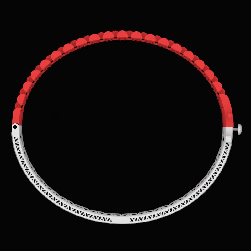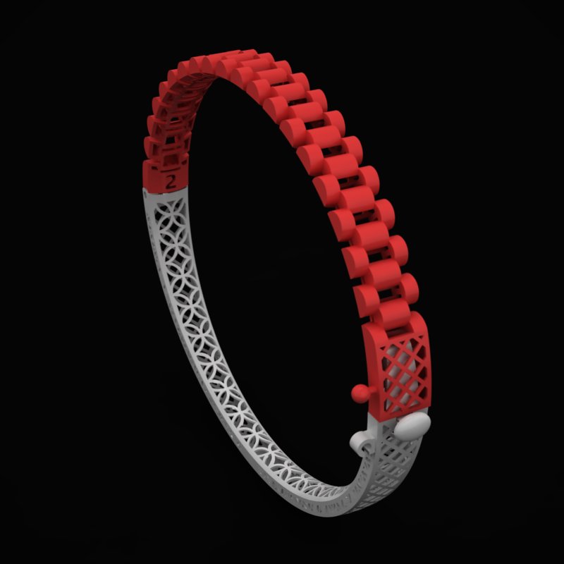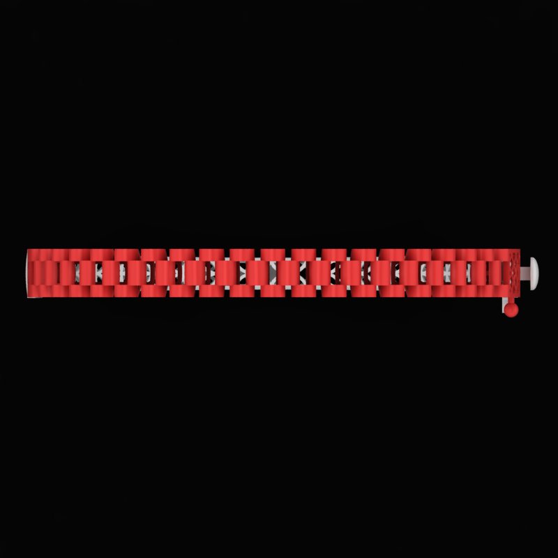 دستبند رولکس D-Rolex-06 با ساختاری مبتنی بر لینک های منظم و صیقلی، ظاهری کاملاً یکدست و مدرن ارائه میدهد. بخش بیرونی با قطعات حجمی قرمز رنگ در رندر، شباهتی قوی به بند های کلاسیک رولکس دارد و به صورت منظم روی دست قرار میگیرد. فرم یکنواخت و ریتم تکرار شوندهی این لینک ها، حسی از نظم، قدرت و ظرافت مهندسی شده را منتقل میکند.