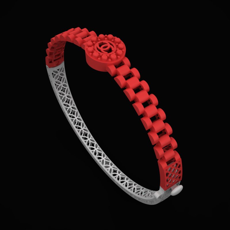 دستبند رولکس D-Rolex-10 با طراحی مدولار و الهام گرفته از بند های کلاسیک ساعت رولکس، جلوه ای منحصر به فرد و مدرن ایجاد کرده است. بخش بالایی دستبند با قطعات مکعبی منظم و حجیم طراحی شده تا احساس استحکام و نظم هندسی را منتقل کند. در مرکز این بخش، نشان سلطنتی و ظریف رولکس به صورت برجسته قرار گرفته که هویت طراحی را کاملتر میسازد و کار را از دیگر مدل های مشابه متمایز میکند.