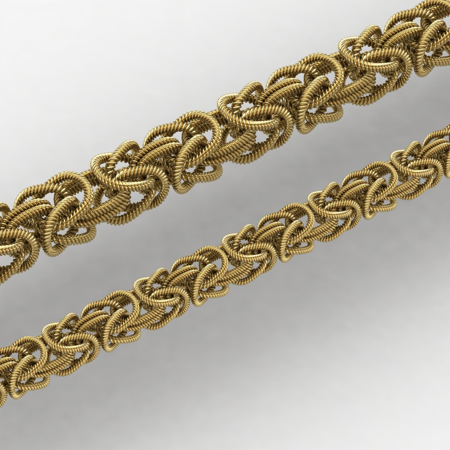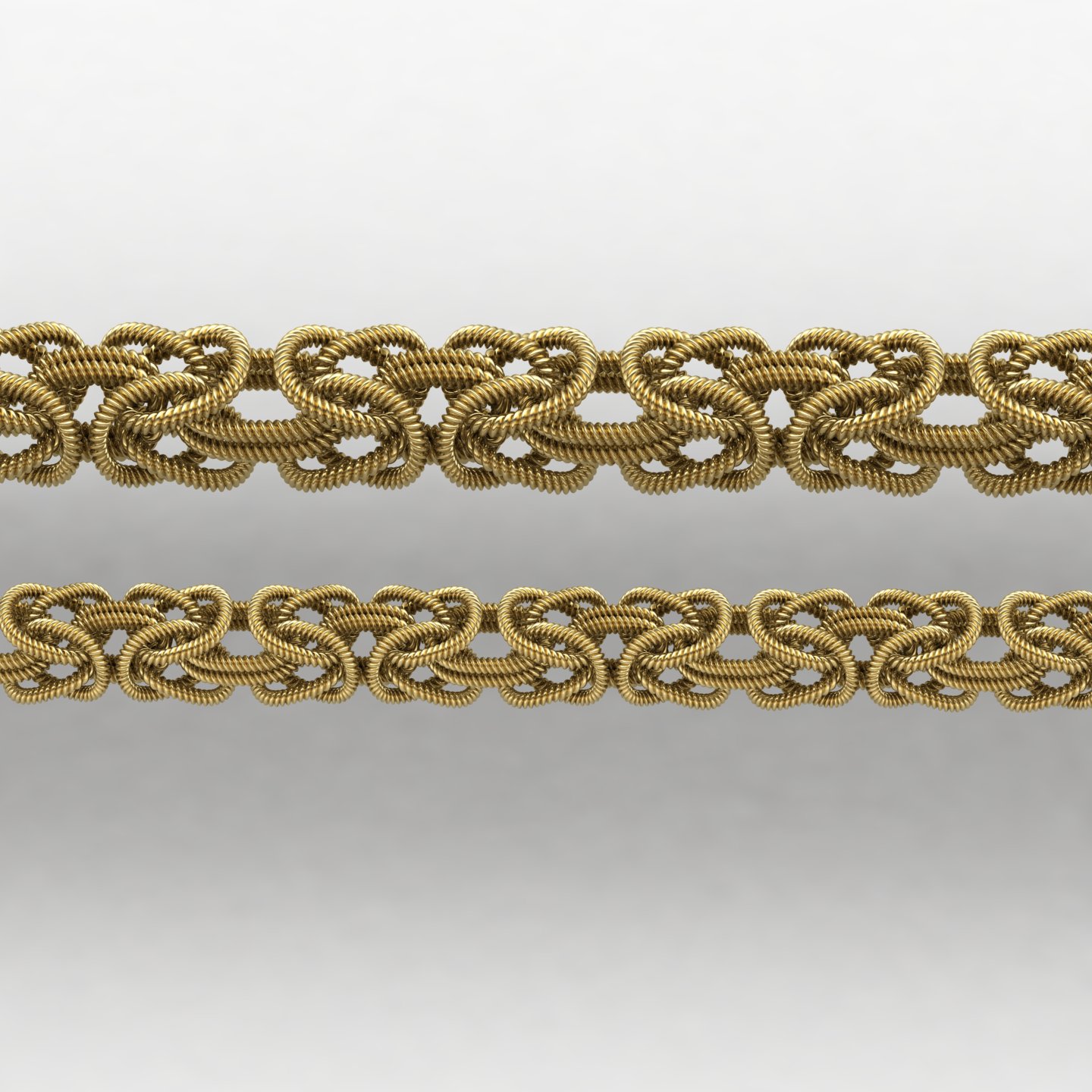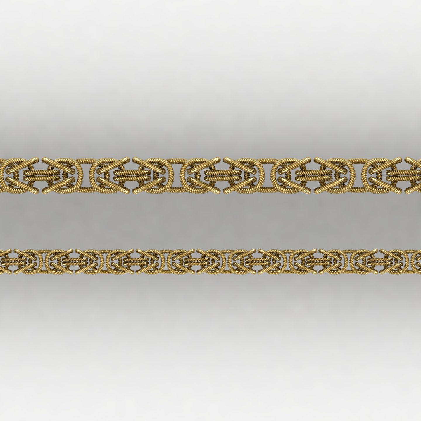 در طراحی بیزانسی پیچ خورده 03، هر حلقه به گونه ای با دیگری درآمیخته که ساختار کلی شبیه به طناب های سلطنتی تاریخی به نظر می رسد. این فرم پیچیده نه تنها ظاهر لوکس بلکه حرکت نرم و روانی در هنگام استفاده ایجاد میکند. زنجیر به دلیل هندسه خاص خود نور را در هر زاویه منعکس کرده و به شکلی طبیعی برق طلا و نقره را درخشانتر جلوه میدهد.