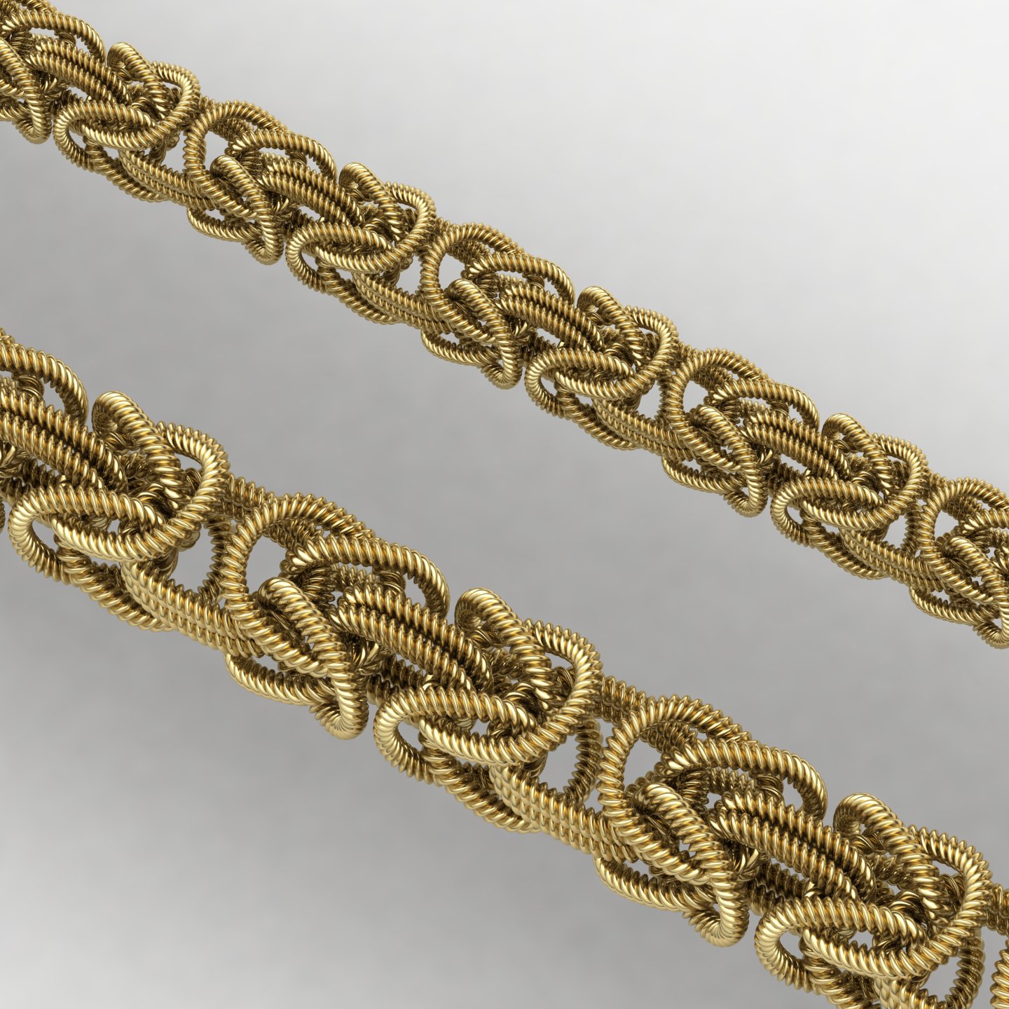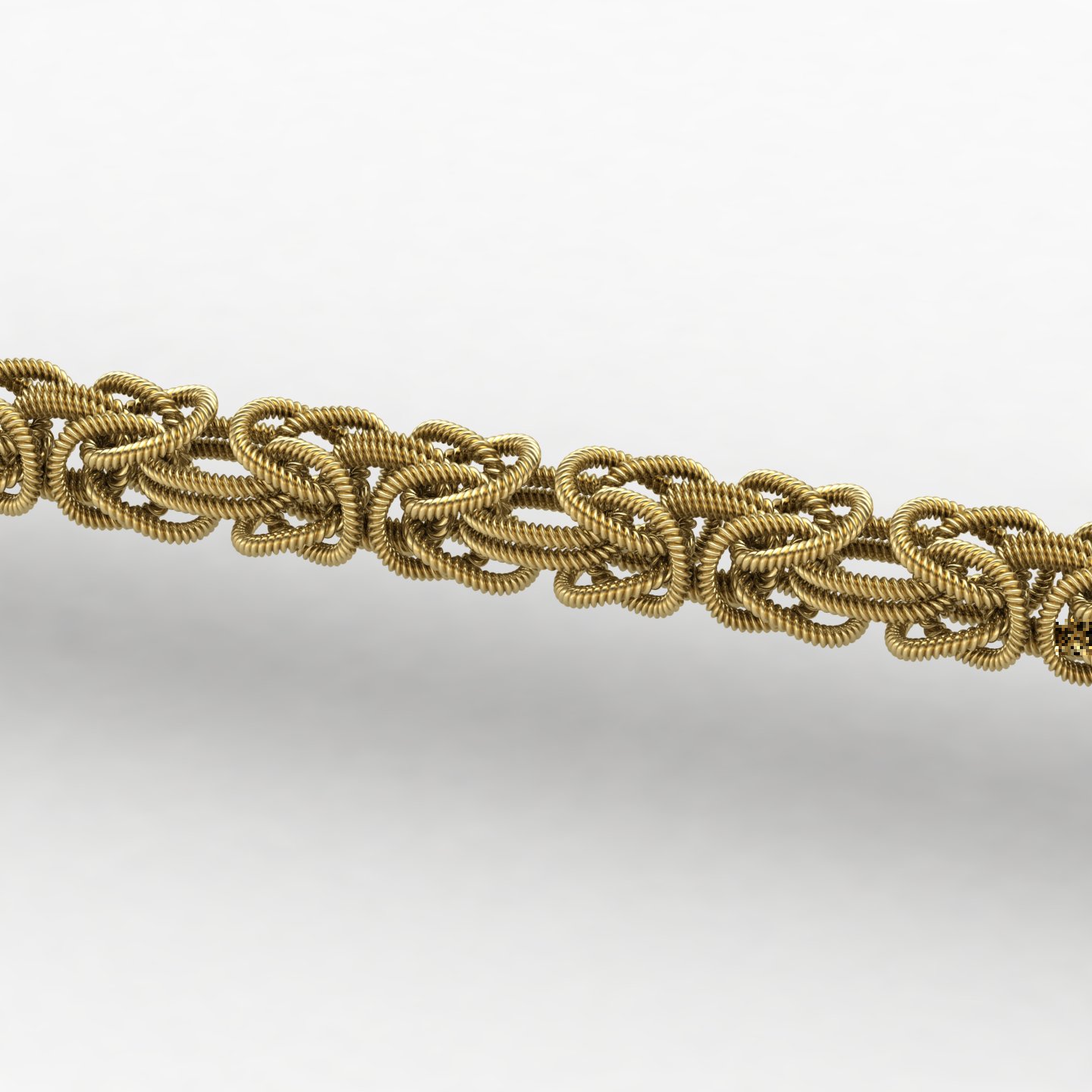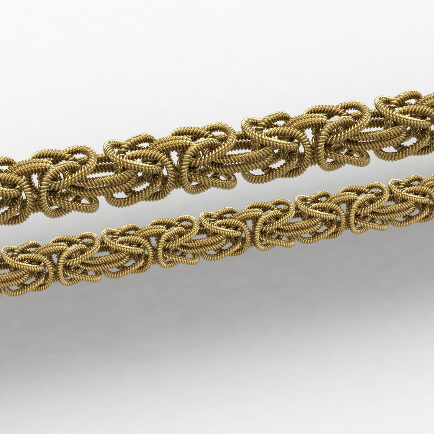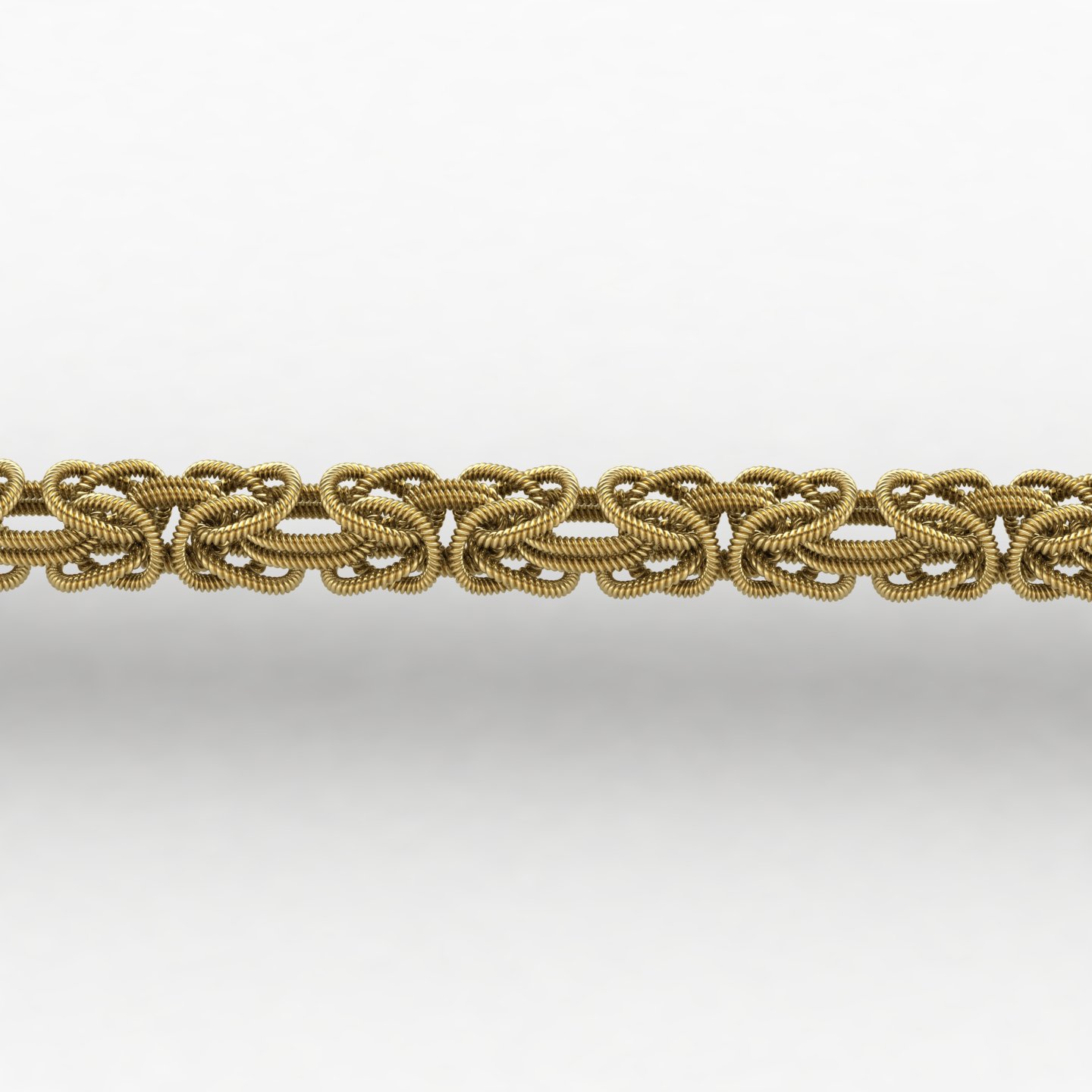 در طراحی بیزانسی پیچ خورده 03، هر حلقه به گونه ای با دیگری درآمیخته که ساختار کلی شبیه به طناب های سلطنتی تاریخی به نظر می رسد. این فرم پیچیده نه تنها ظاهر لوکس بلکه حرکت نرم و روانی در هنگام استفاده ایجاد میکند. زنجیر به دلیل هندسه خاص خود نور را در هر زاویه منعکس کرده و به شکلی طبیعی برق طلا و نقره را درخشانتر جلوه میدهد.