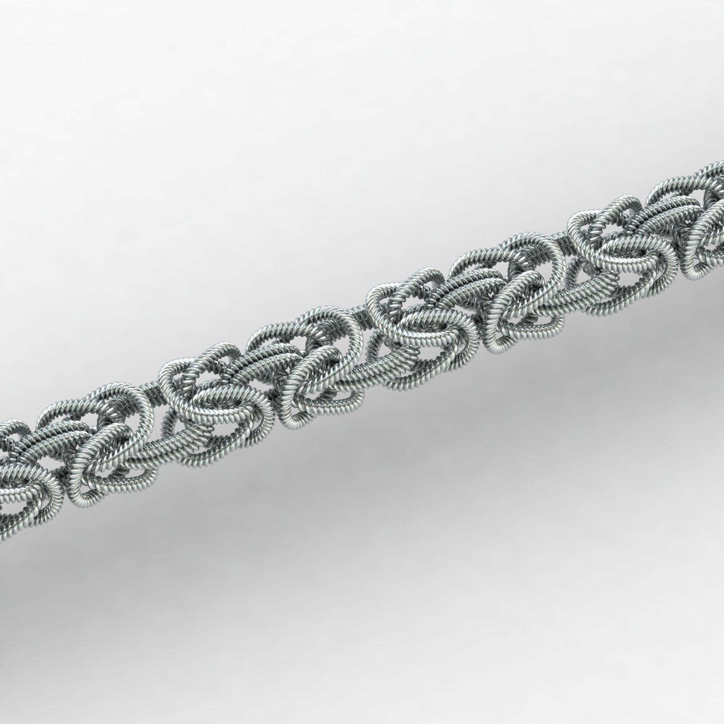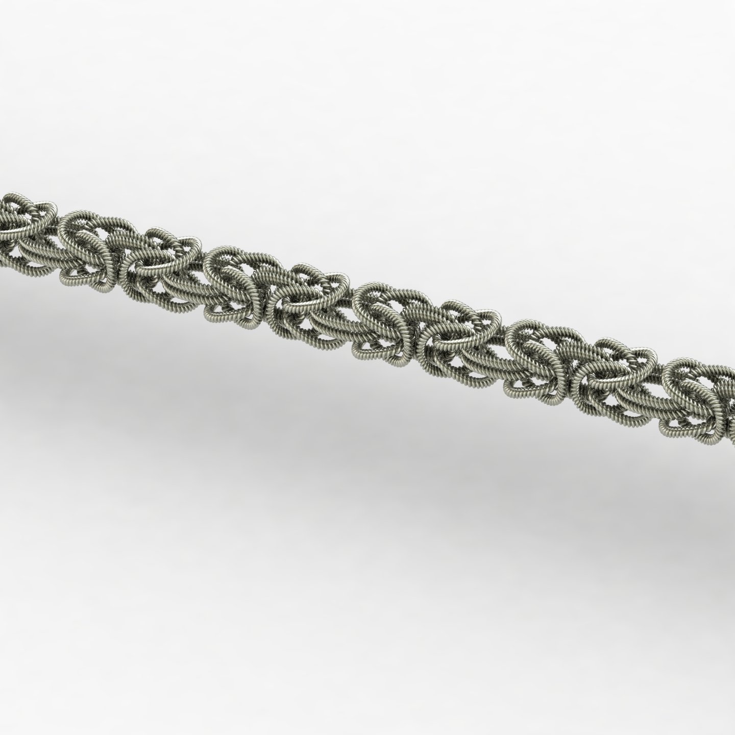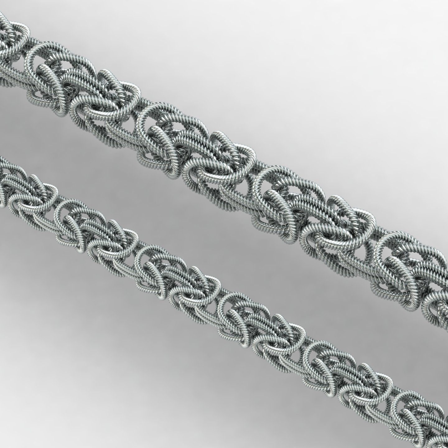ابعاد این مدل متغیر بوده و در ضخامت های ۳۵۰ و ۵۰۰ میکرون عرضه میشود تا برای انواع کاربرد ها از زنجیر گردن تا دستبند مناسب باشد. ساخت با نرم افزار Matrix دقت هندسی بالا و تکرار کامل الگوی بیزانسی را تضمین میکند. خروجی های 3dm و STL امکان چاپ سه بعدی دقیق و تولید صنعتی با کیفیت سطح بالا را فراهم میآورند. این طراحی انعطاف پذیر در عین حال استحکام بینظیری دارد.