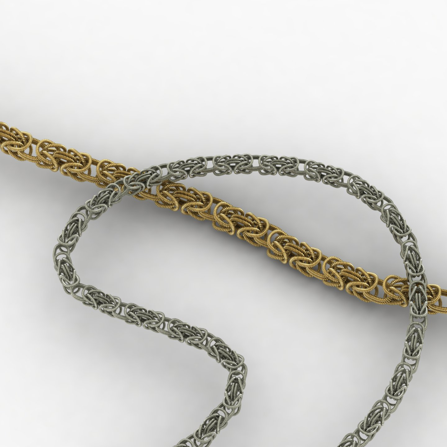 زنجیرهای بیزانسی پیچ خورده 03، نمونه ای فاخر از تلفیق هنر سنتی و مهندسی مدرن است. ساختار حلقه ای پیچیدهی این زنجیر ها با درهم رفتگی منظم و پیوسته، یاد آور طراحی های سلطنتی بیزانس میباشد؛ الگویی که قرن ها نماد قدرت و ظرافت بوده است. ترکیب رنگ طلایی و نقره ای در تصویر، تضادی زیبا و چشم نواز ایجاد کرده که انعکاس نور را دو چندان میکند و جلوه ای خاص به هر پوشش می بخشد.