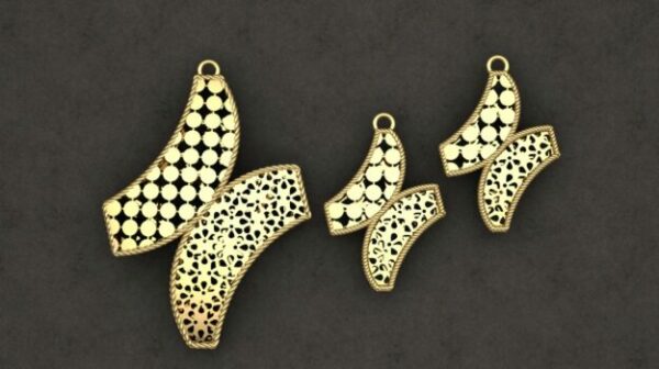 این نیم ست در نرم افزار متریکس طراحی و با فرمت stl آماده اجرای صنعتی یا سفارشی سازی شده است. ابعاد مدال ۲۵ در ۳۵ در ۵ میلیمتر و گوشوارهها ۲۰ در ۱۵ در ۲.۵ میلیمتر با ضخامت بسیار ظریف ۰.۳ میلیمتر، ظرافت ساخت و وزن سبک (۶ گرم) را تضمین میکند. چنین وزنی امکان پوشیدن راحت و طولانی مدت را بدون احساس سنگینی برای مصرف کننده فراهم می کند.