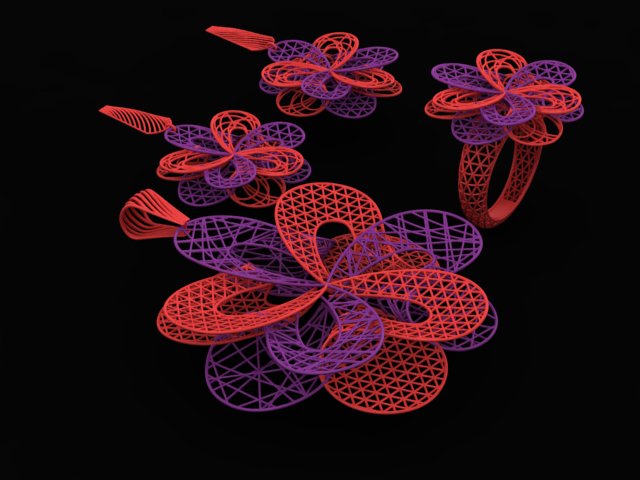 گردنبند 50*50 میلیمتر، پاپیون 10*4 میلیمتر، گوشواره 25*25 میلیمتر، میخ گوشواره 13*5 میلیمتر، انگشتر 28*23.8*25 میلیمتر