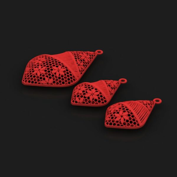 فرم دو قسمتی آویز و گوشواره ها، ترکیبی از خطوط منحنی و سطوح گل دار است که در نرم افزار Matrix با دقت بالا و فرمت stl مدل سازی شده اند. ابعاد آویز 31.5*21.5*6.5 میلیمتر و گوشواره 20.5*14*3.8 میلیمتر تنظیم شده و ضخامت ظریف ۰.۲۸ میلیمتر وزن سبک ۴ گرم را به ارمغان می آورد. این مشخصات، علاوه بر حفظ راحتی، امکان پوشیدن طولانی مدت را بدون ایجاد سنگینی فراهم می سازد.