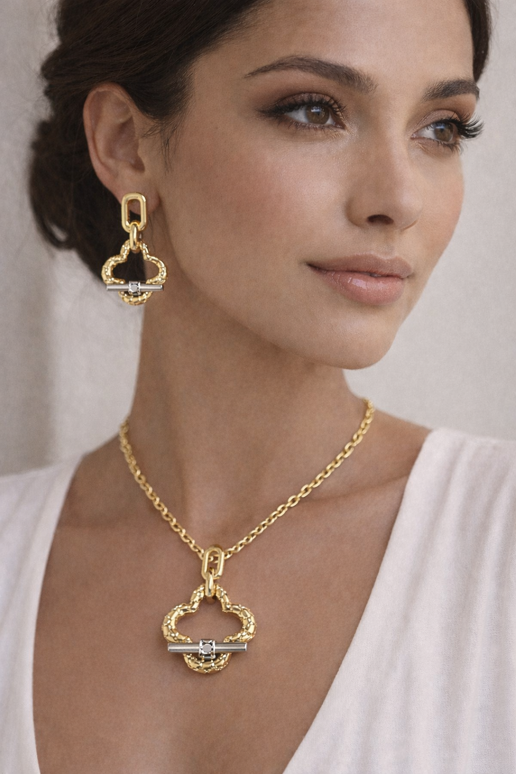 نیم ست کد 02 با طراحی مدرن و فرم هندسی خاص، انتخابی متفاوت برای افرادی است که به زیورآلات امروزی و خاص علاقه مندند. ترکیب خطوط نرم با بافت تزئینی روی بدنه، جلوه ای چشم نواز ایجاد کرده که در عین سادگی، حس لوکس و حرفه ای را منتقل میکند. این طراحی به گونه ای انجام شده که هم در استفاده روزمره و هم در استایل های رسمی بدرخشد.