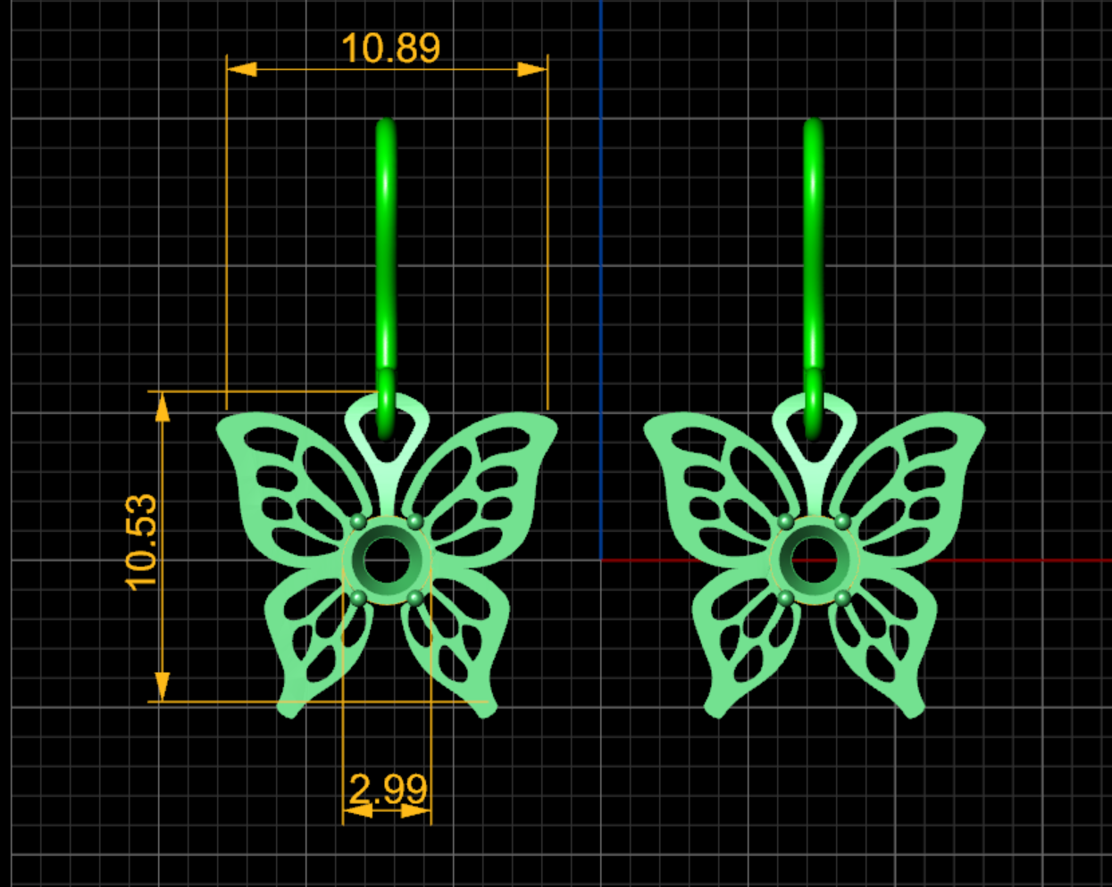 طراحی این گوشواره در نرم افزار حرفه ای متریکس انجام شده و خروجی فنی آن با فرمت STL ارائه میشود تا تمام جزئیات ظریف از خم بال ها تا محل چنگک نگین دقیق و قابل اجرای سه بعدی باشد. ساختار هندسی پروانه و تنظیم زاویه قلاب ها طوری در مدل لحاظ شده که هنگام آویختن، گوشواره به زیبایی در زاویهی مناسب دیده شود و تعادل بصری را حفظ کند.